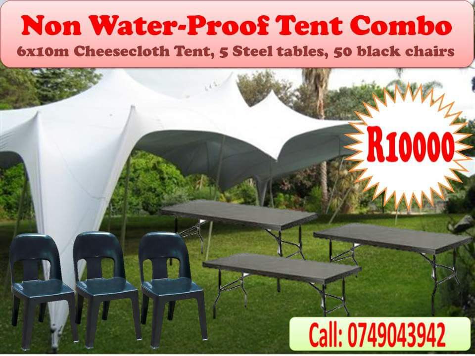 6X10 Cheesecloth Tent, 5 Steel tables, 50 black chairs